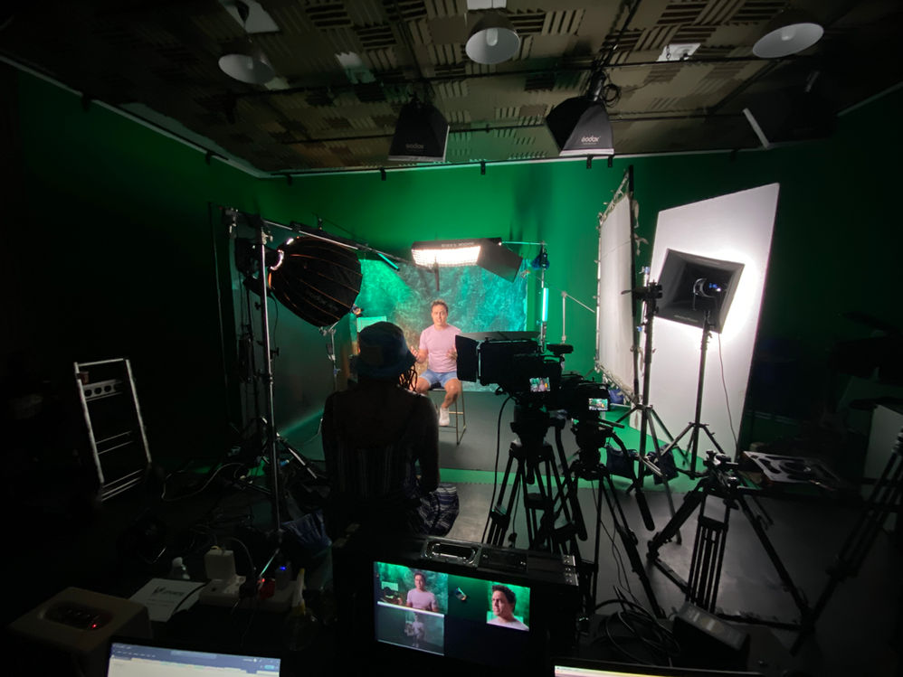 Full wall-to-wall wrapped green screen cyclorama for seamless backgrounds and controlled visual environments.